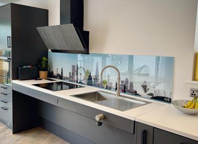 The kitchen offers rising work surface including the sink, hob and preparation area.