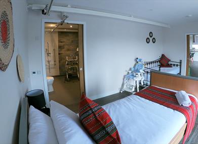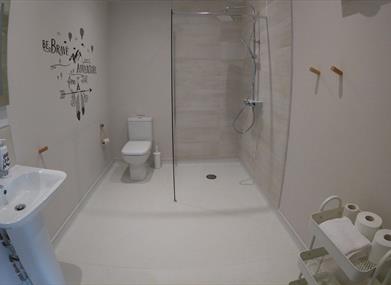 Luxury disabled holiday accommodation with a specialist anti allergy interior. Mountain Lodge has three stunning en-suite bedrooms, one with a welcoming king size bed, one that may be configured as a double or twin room. Our specialist room is fitted with a profiling bed with a H frame tracking hoist through to the bathroom and carer bed. The whole accommodation has been purpose designed and built for accessible living and enjoyment. All the rooms are light and spacious and have patio doors leading outside for easy and safe access. The accommodation comprises 3 bathrooms, one has a free-standing bath, another a walk-in shower and the purpose built en-suite also boasts a wet room based on changing places design. It has a wet room shower, shower seat, changing bench, wheelchair accessible sink, high toilet and grab rails.