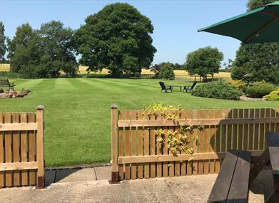 Fenced patio area with outside seating overlooking the garden, pond and fields